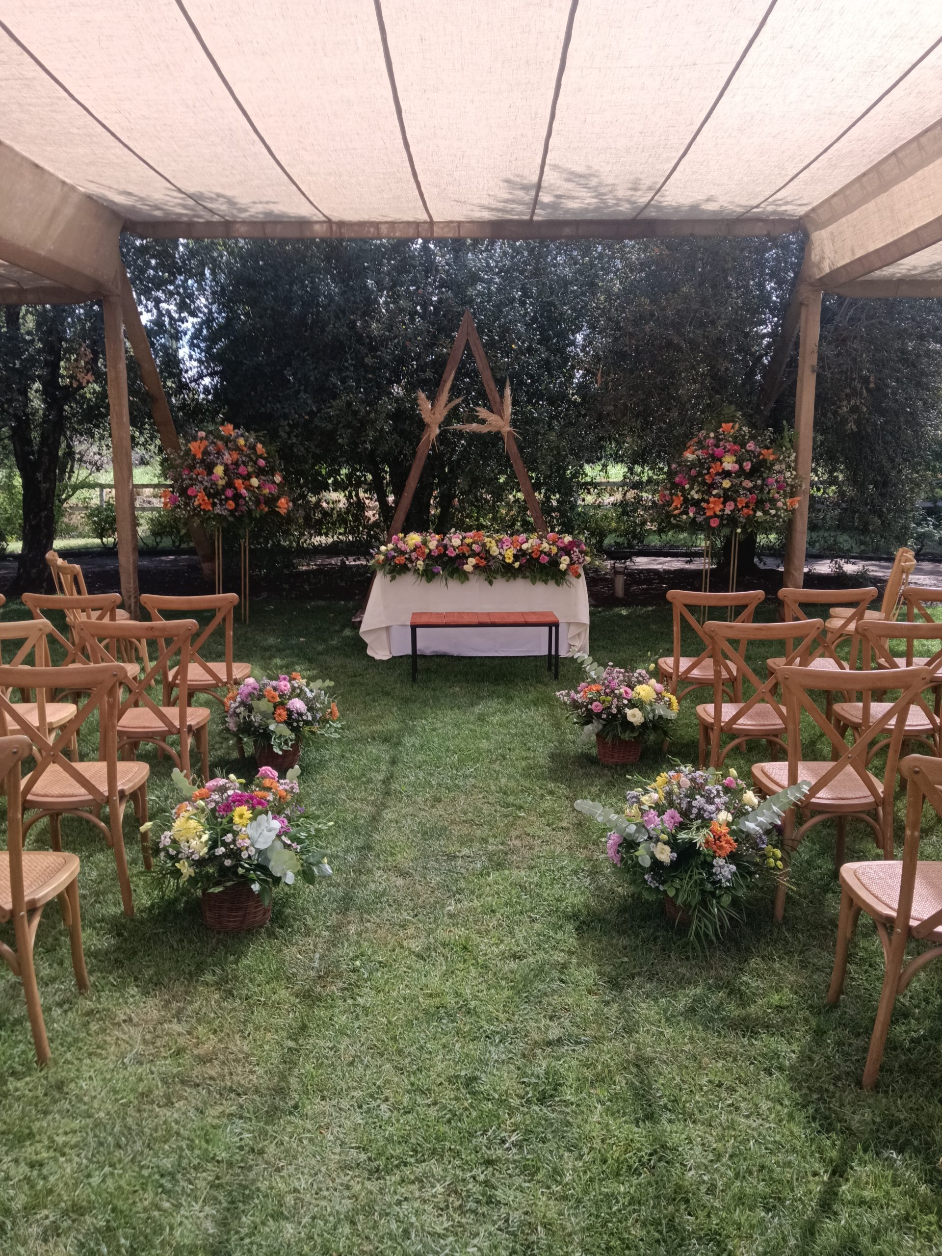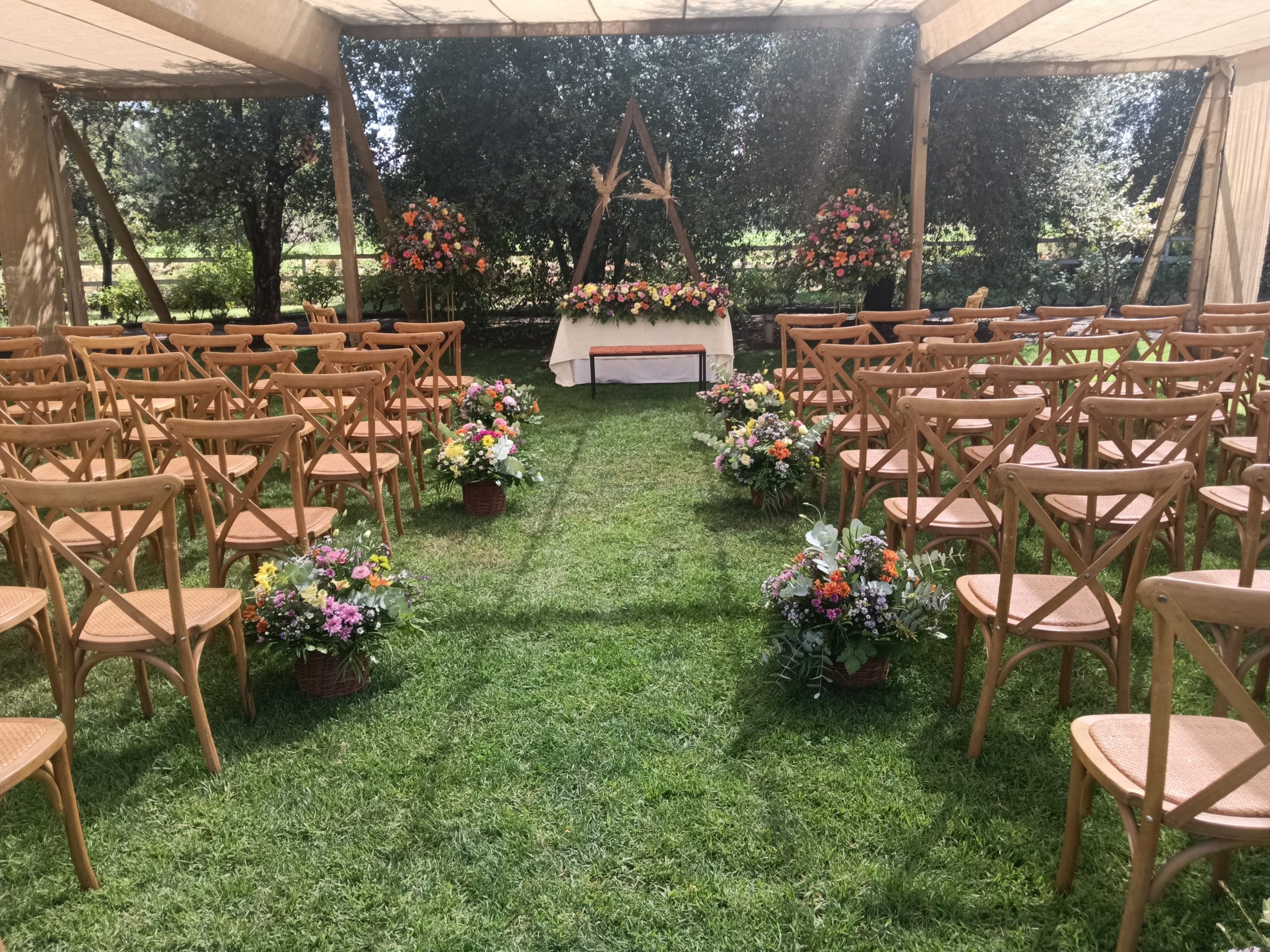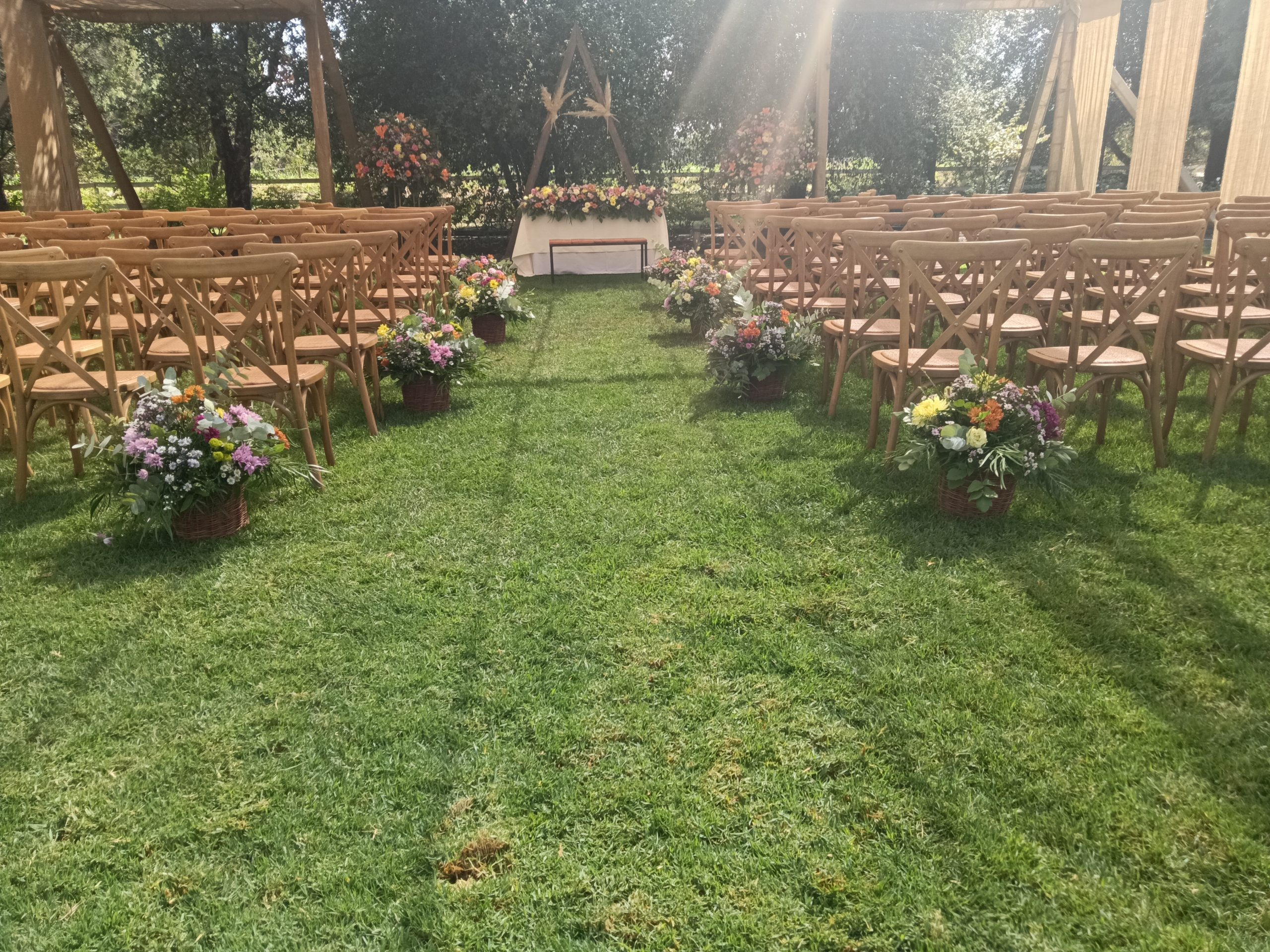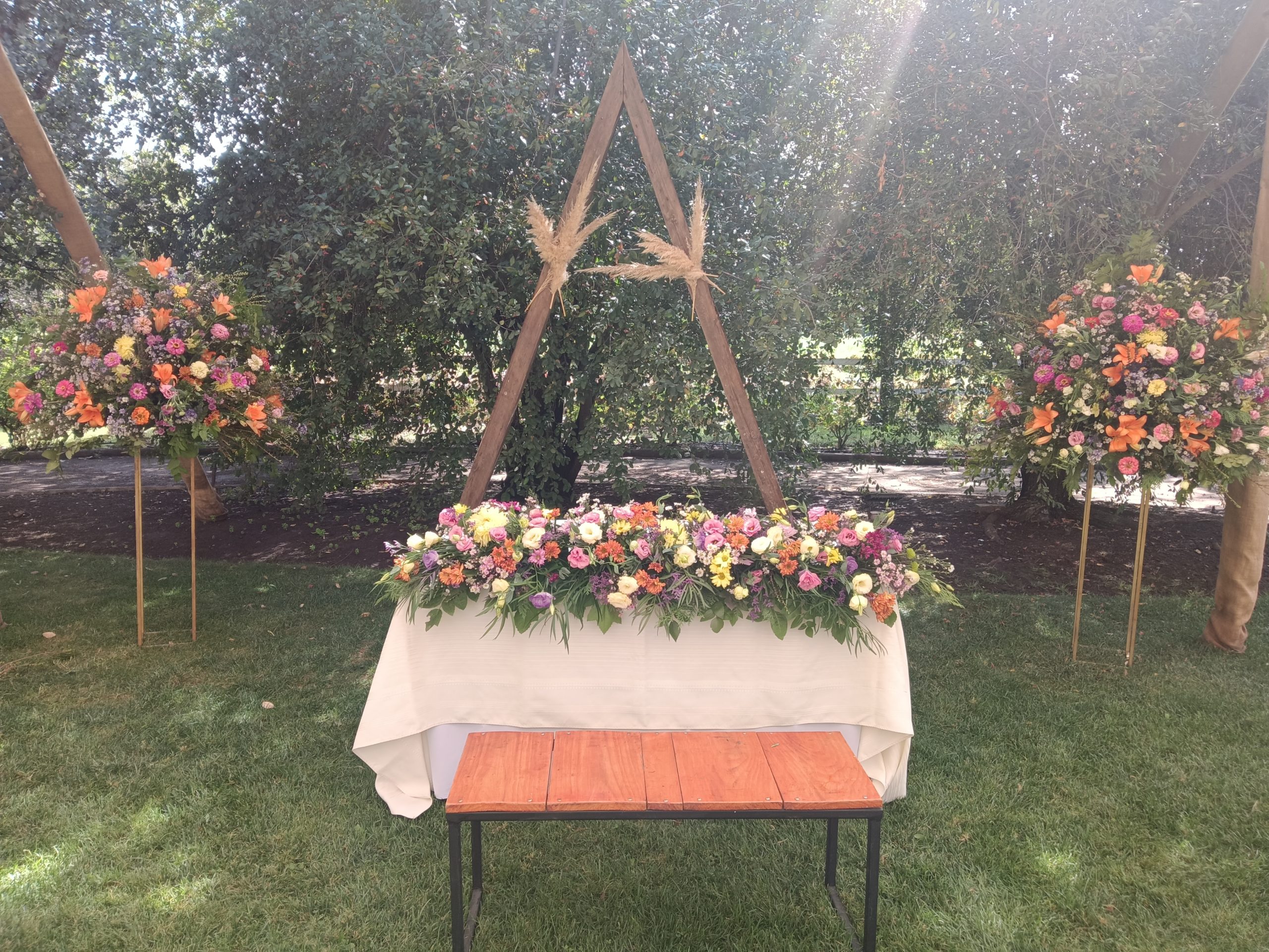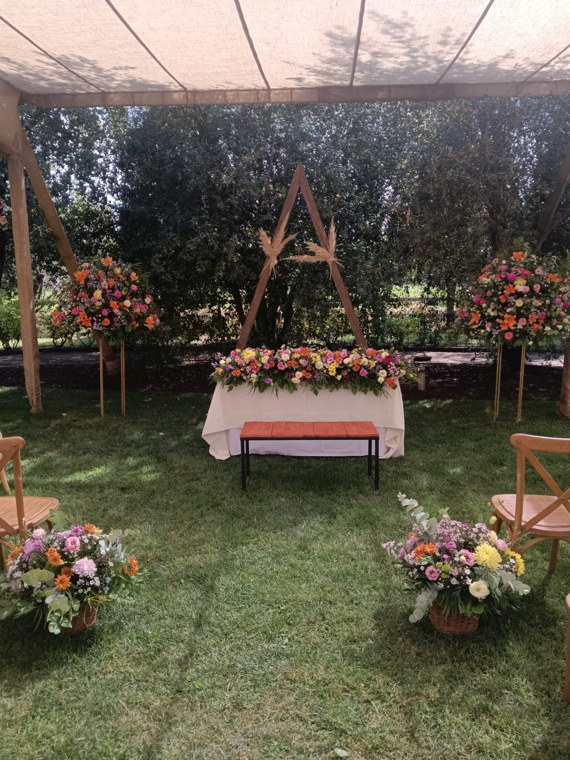 Hermosos arreglos florales…altar al aire libre.